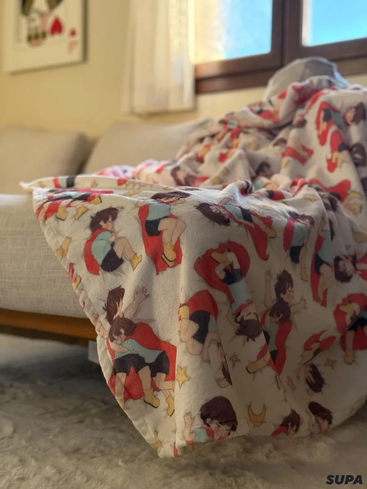 Design: Full-print artwork on one side, soft white fleece on the other